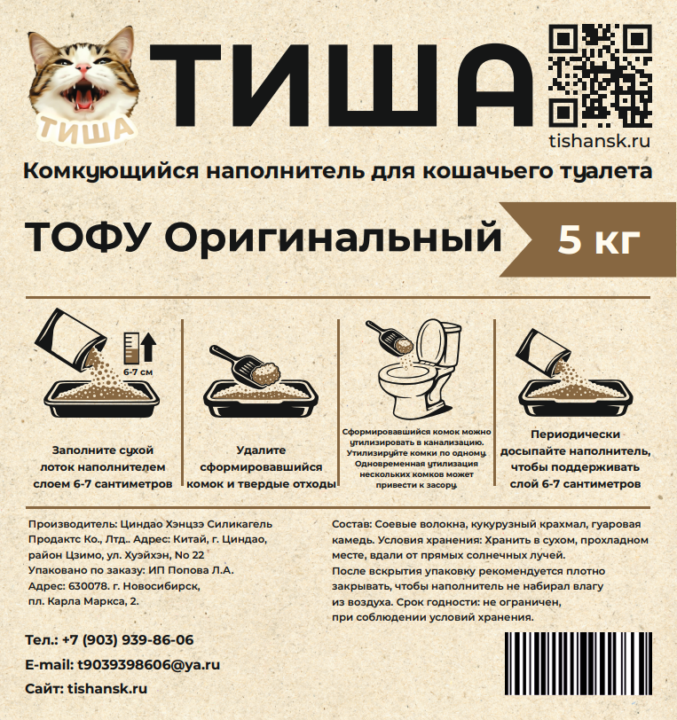 Комкующийся растительный наполнитель для кошачьего туалета "ТИША ТОФУ" — это экологичное решение для гигиены вашего питомца на основе натуральных волокон сои (тофу).